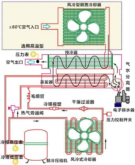 1、 Laifu freeze type compressed air dryer (lyophilizer) is a special equipment used to deal with the free water, oil and solid suspended solids in the atmosphere, and produce low-quality compressed air after being compressed by air compressor. Tyad and tycd type freeze dryers are mainly purified by air source of small and medium-sized air compressor stations. According to the requirements of using process, the auxiliary units such as filter, cooler, gas-liquid separator and precision filter are selected reasonably. Working principleThe amount of water vapor in compressed air is determined by the temperature of compressed air: in the case of keeping the pressure of compressed air basically unchanged, reducing the temperature of compressed air can reduce the content of water vapor in compressed air, and the excess water vapor will condense into liquid. According to the corresponding relationship between saturated vapor pressure and temperature of water, the refrigeration device is used to cool the compressed air to a certain dew point temperature to separate out the contained water. The water is discharged through the steam water separator and the electric drainer, so that the compressed air can be dried.